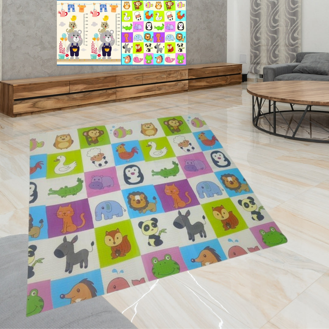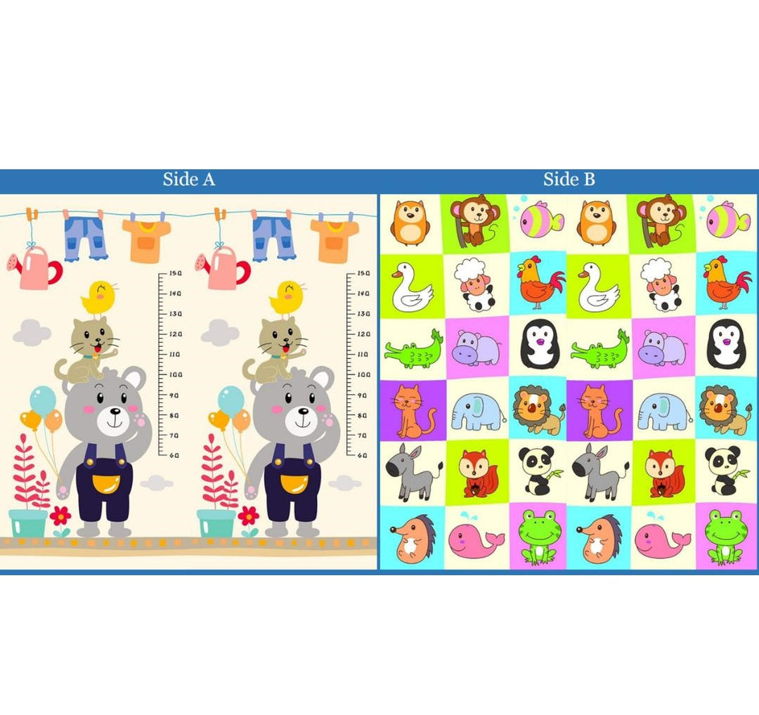 Двустранният дизайн е показан в снимките. Сгъваемата постелка за игра е сертифицирана по стандартите на ЕС, с термоизолация, неплъзгаща се, с двустранен дизайн. Всяка подложка е петслойна и изработена от материали, които щадят околната среда. Повърхностният слой на сгъваемата постелка за игра е покрит с фолио и е устойчив на влиянието на околната среда. Слой от специална XPE пяна осигурява топлина и мекота, давайки на детето усещане за сигурност по време на неговото развитие, започвайки от момента, в който мъничето бъде поставено по корем. Този материал е безопасен, нетоксичен, устойчив на влага и замърсяване. Не събира прах, което е важно за деца с алергии.