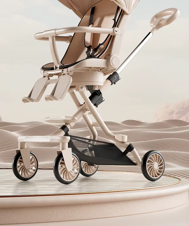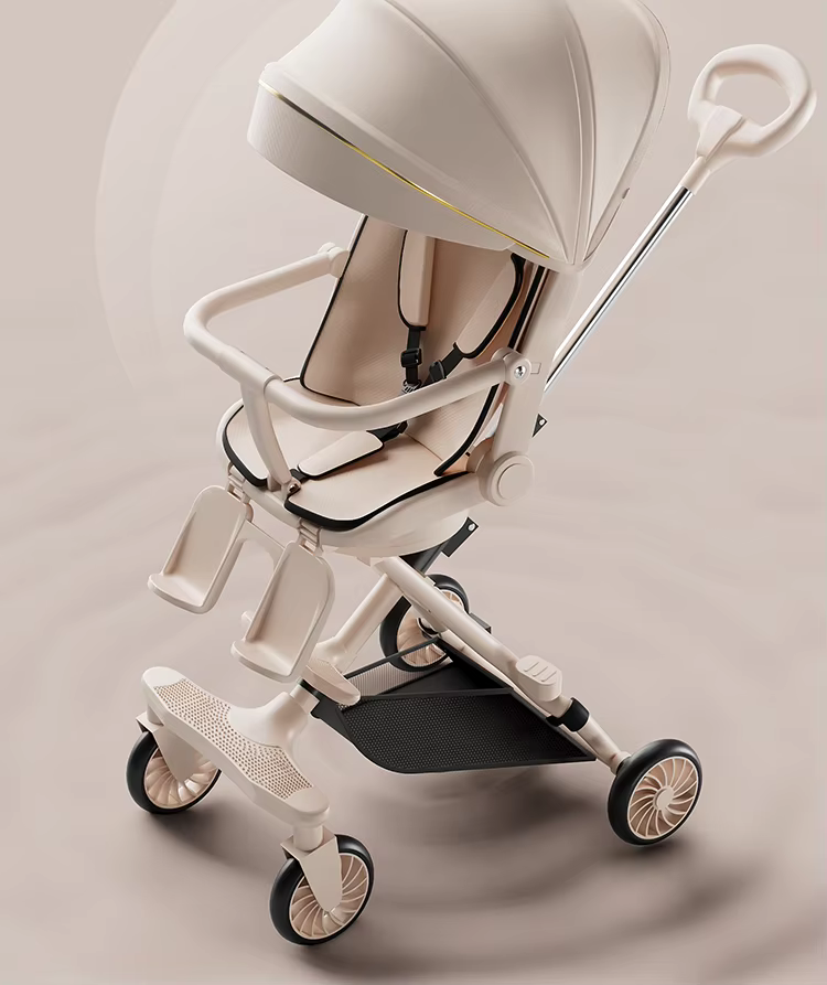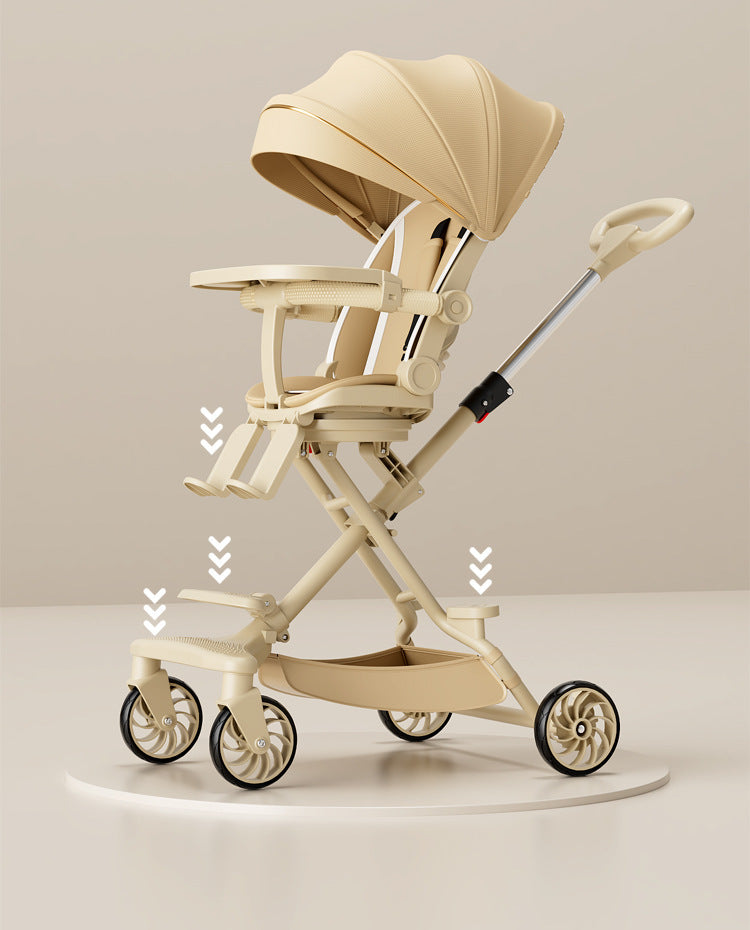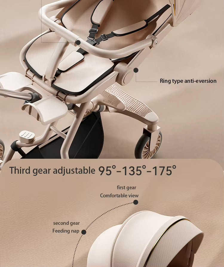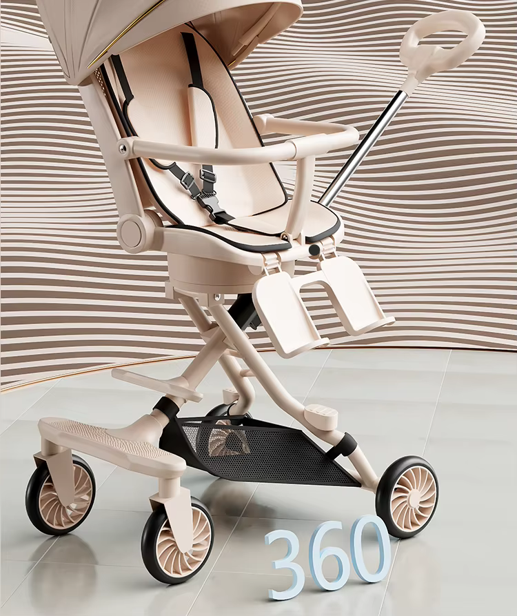 360° въртящи се колела, амортисьори, спирачка с едно натискане и 5-точков колан за сигурност. Антиподхлъзващ дизайн за допълнителна стабилност, дори при неравен терен.