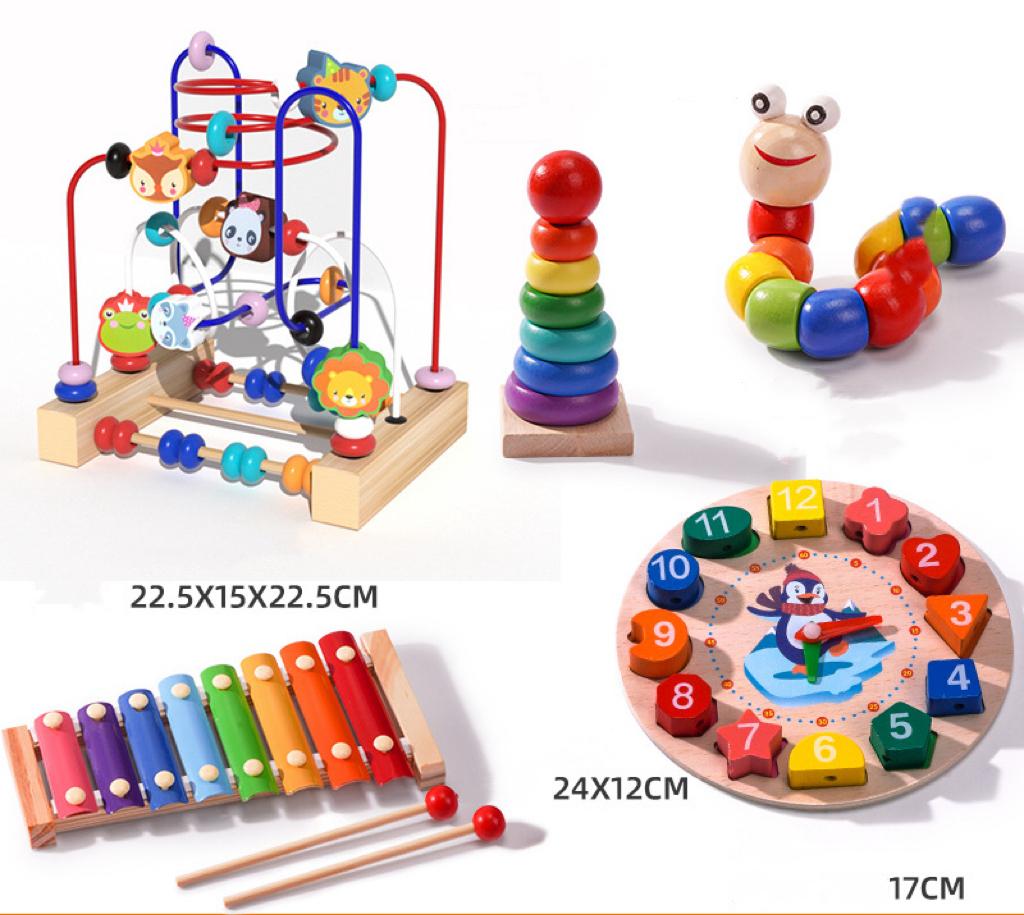 Този комплект включва 5 различни дървени играчки, които стимулират развитието на фината моторика, координацията, логическото мислене и сетивата на вашето дете.