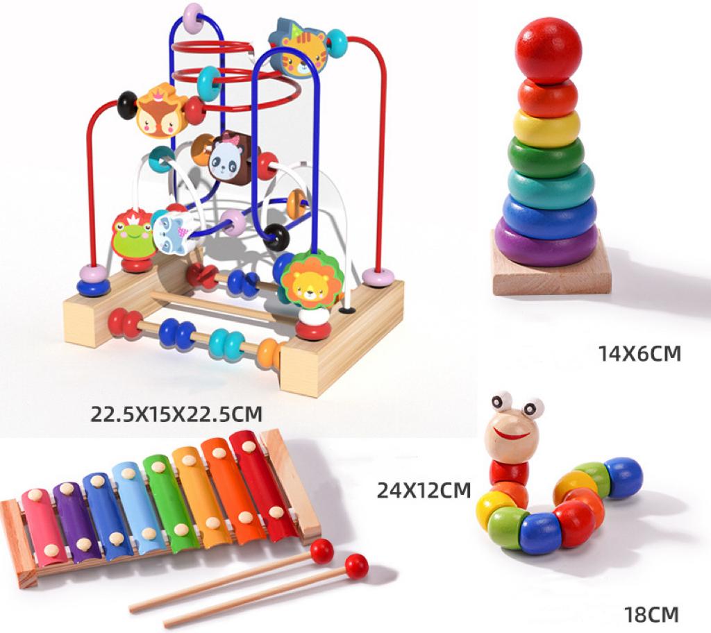 Играчките са изработени от естествено дърво, боядисани с нетоксични бои и проектирани да развиват фина моторика, координация, слух и логическо мислене.