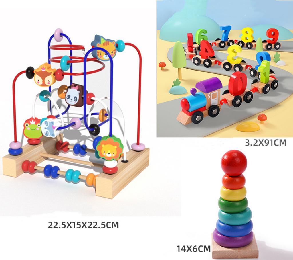 Този комплект съчетава три различни дървени играчки, всяка от които развива различни умения: логика, моторика, концентрация, броене и сортиране. Идеален избор за деца от 12+ месеца.